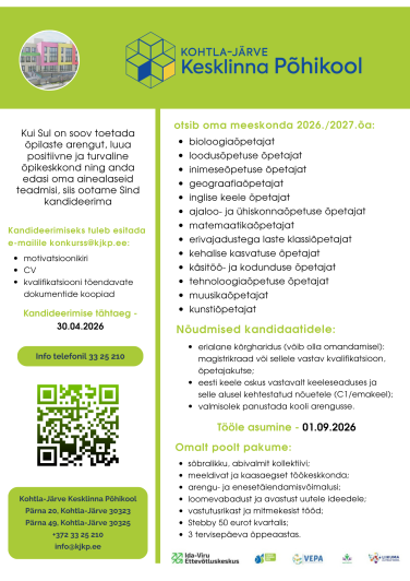 Tööle asumine: 01.09.2026 Kandideerimiseks tuleb esitada Kandideerimise tähtaeg - 30.04.2026 Info telefonil 33 25210 |