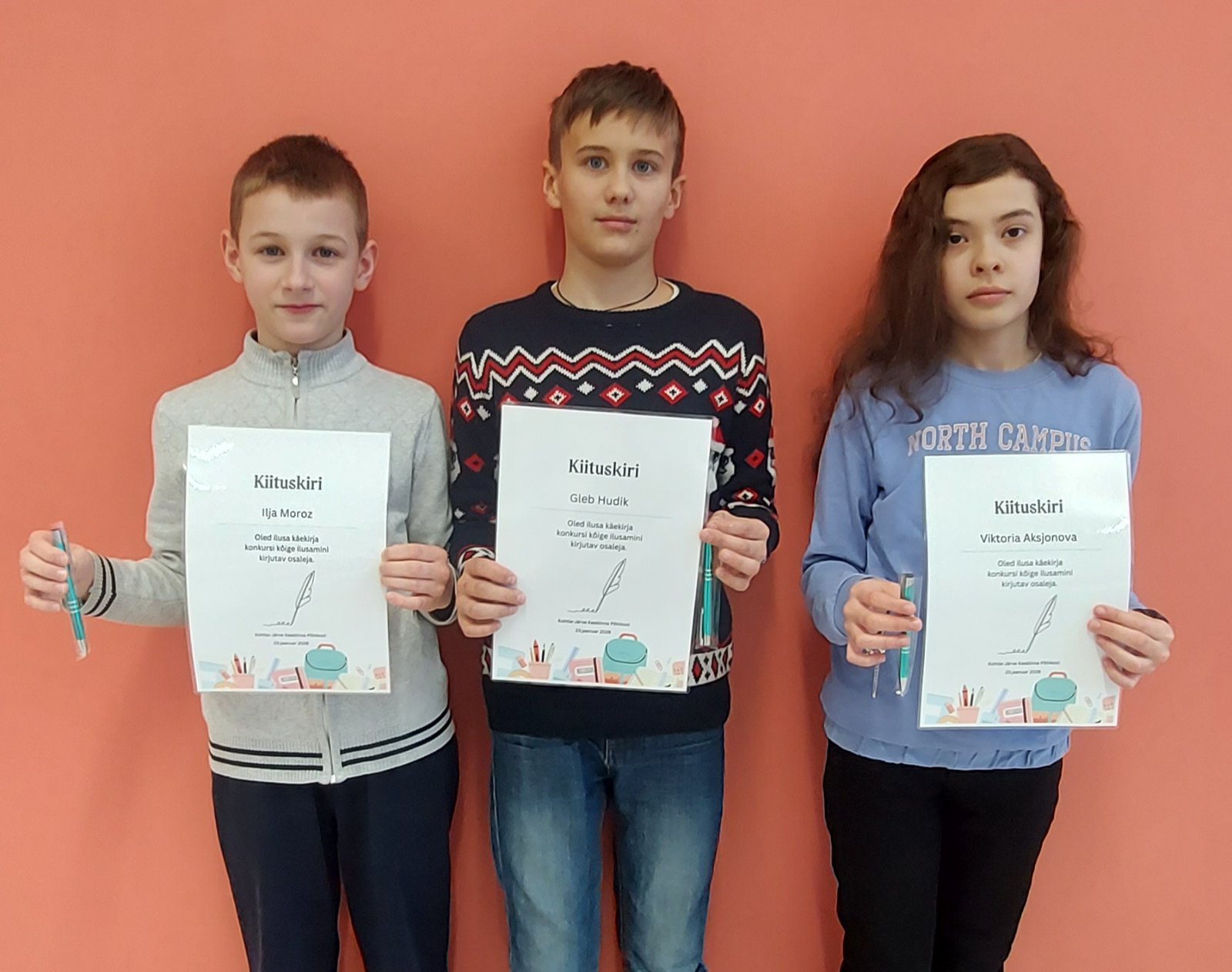 Võitjad said tunnistused ja pastakad kirjaga „Kalligraaf 2026”.
