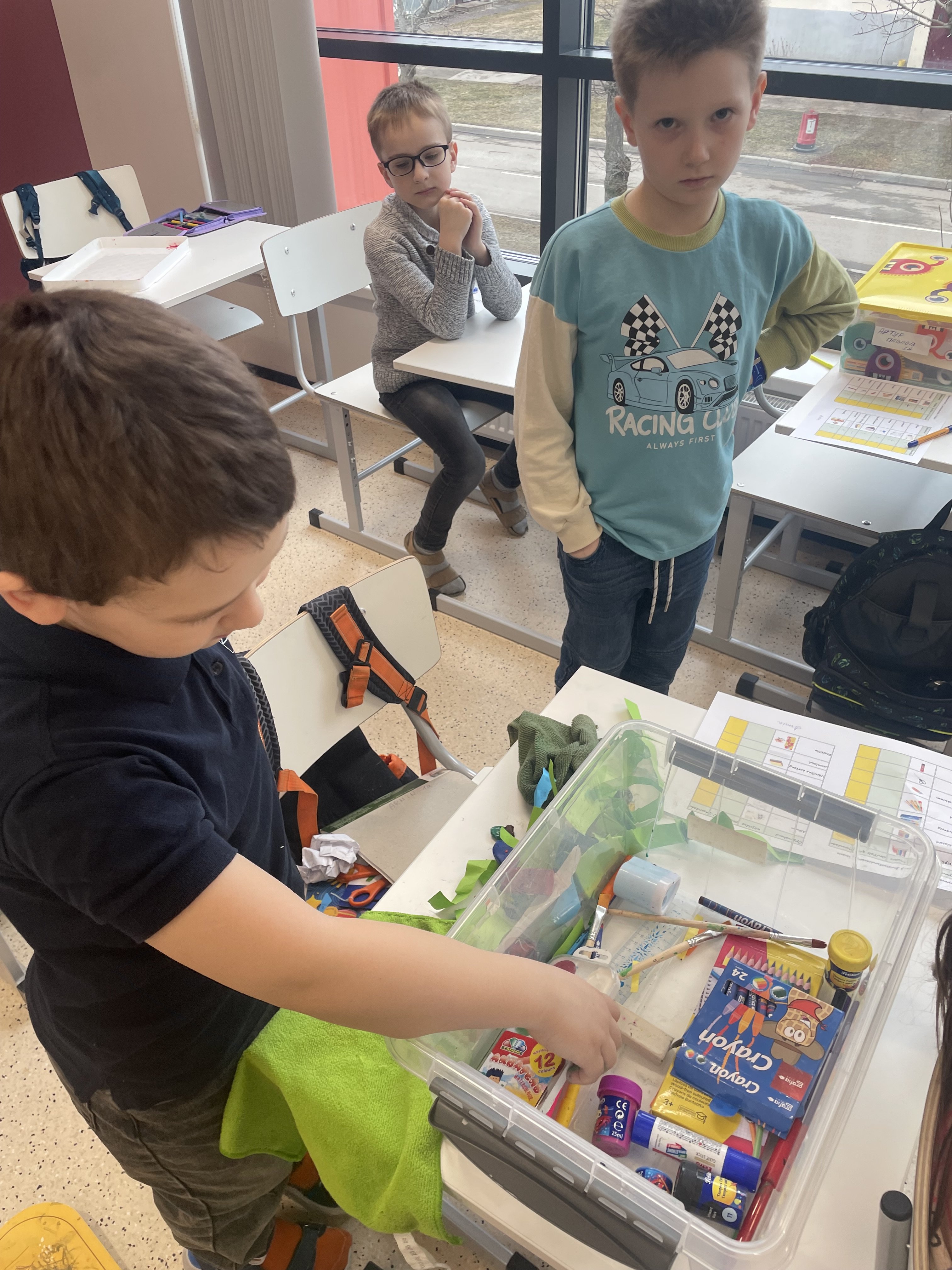 Lapsed asusid ülesande kallale suure entusiasmiga. Nad puhusid puhtaks tööõpetuse ja kunstitunni karbid ning pesid kapid, kus nende tarvikud on. Iga õpilane pani korda oma isikliku karbi, asetades kõik hoolikalt paika.