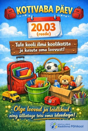 Reedel, 20.03, toimub meie koolis kotivaba päev. See tähendab, et võite tulla kooli ilma koolikotita ning tuua oma asjad erinevates huvitavates ja ebatavalistes kandmisvahendites (näiteks kastis, kohvris, korvis, ämbris või mõnes muus nutikas lahenduses).