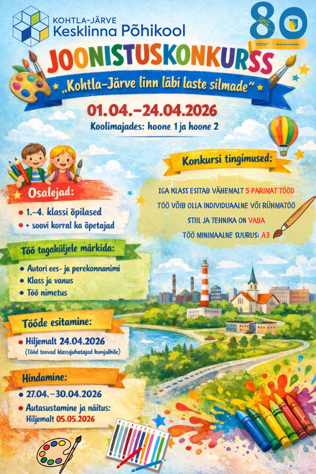 Teema „Kohtla-Järve linn läbi laste silmade“ annab võimaluse lasta fantaasial lennata ja kujutada oma lemmikkohti, mälestusi ja unistusi. Iga klass esitab vähemalt 5 A3-formaadis tööd. Parimad joonistused leiavad koha näitusel!